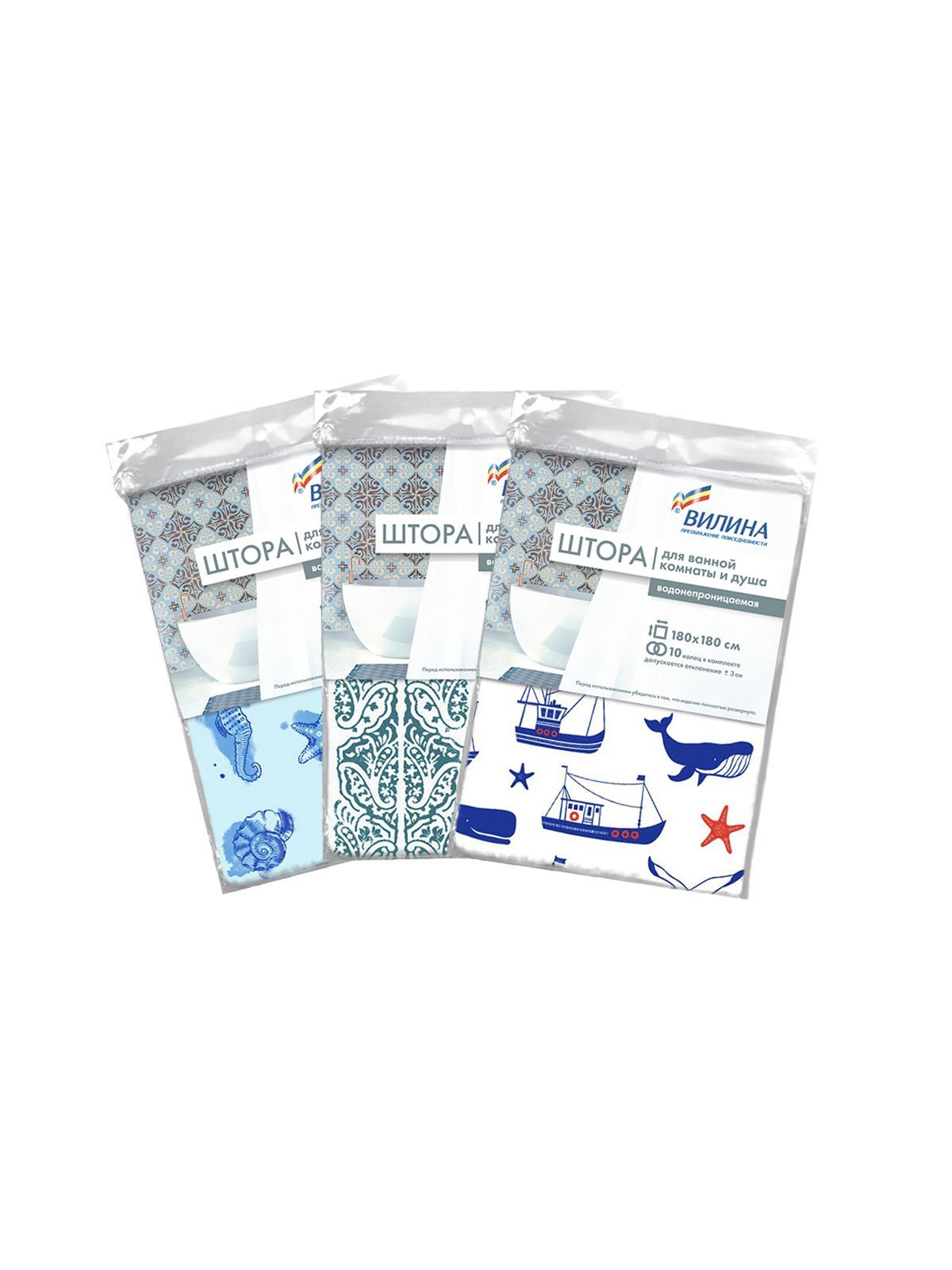 Шторы для ванной комнаты с рисунком. Состав: полиэтилен (в комплекте 10 колец; материал колец - полипропилен). Размер 180*180 см. Индивидуальная упаковка. Производство: Россия. Товар декларирован и со