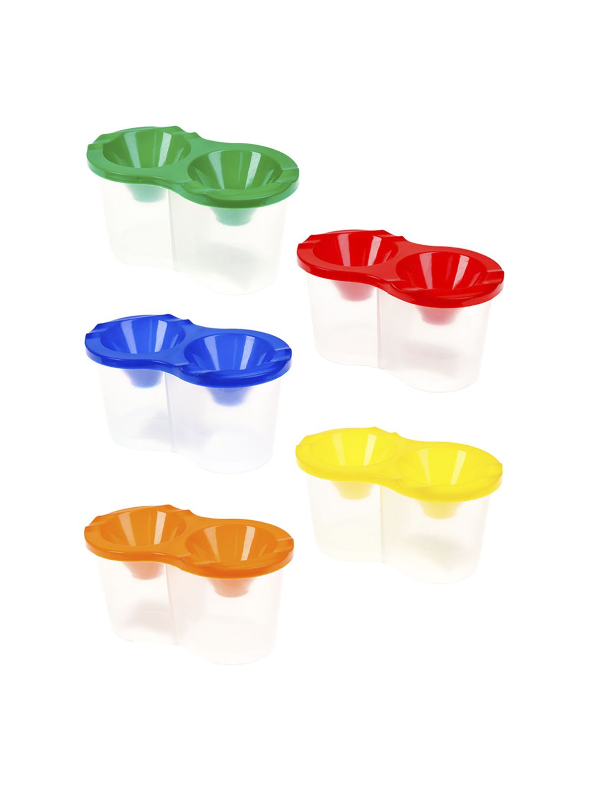 Двойной стакан-непроливайка идеально подойдет как школьникам на уроках рисования, так и маленьким художникам дома и в детском саду! Крышка с отверстиями в центре имеет желобки для кистей. При заполнен