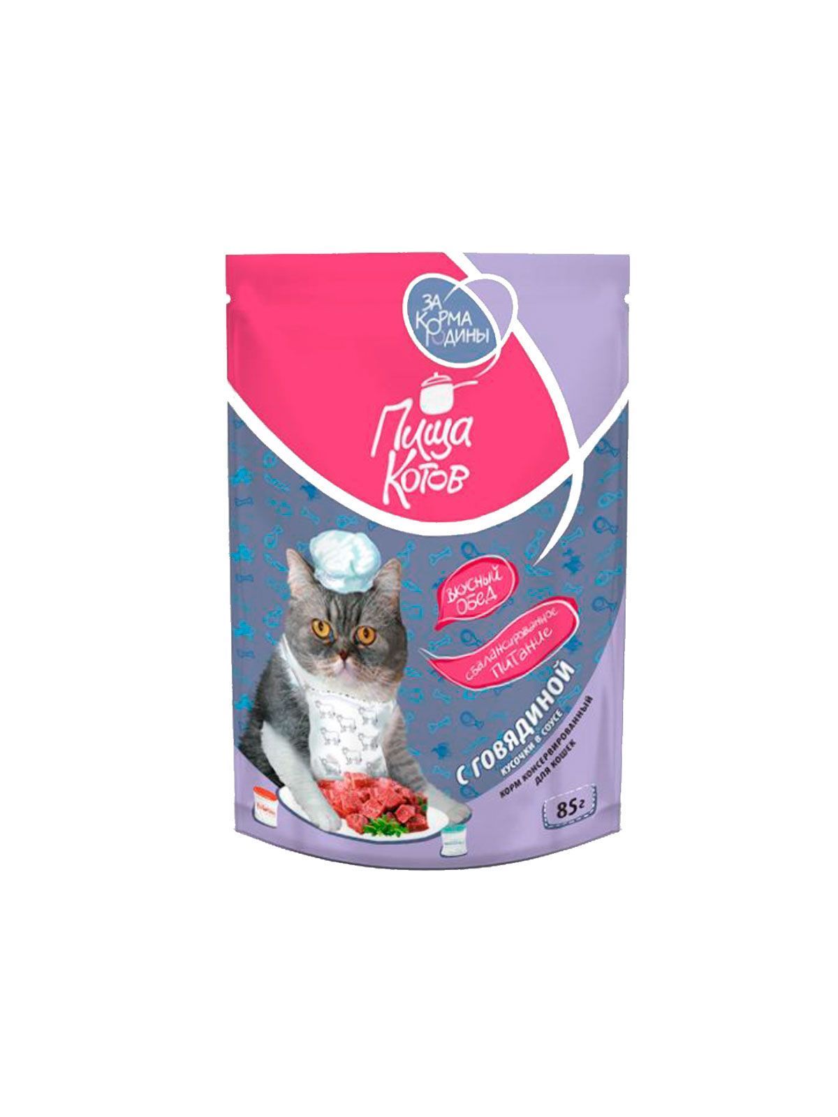 Влажный корм ЗА КОРМА РОДИНЫ для кошек "Пища котов с говядиной, кусочки в соусе" 85 г