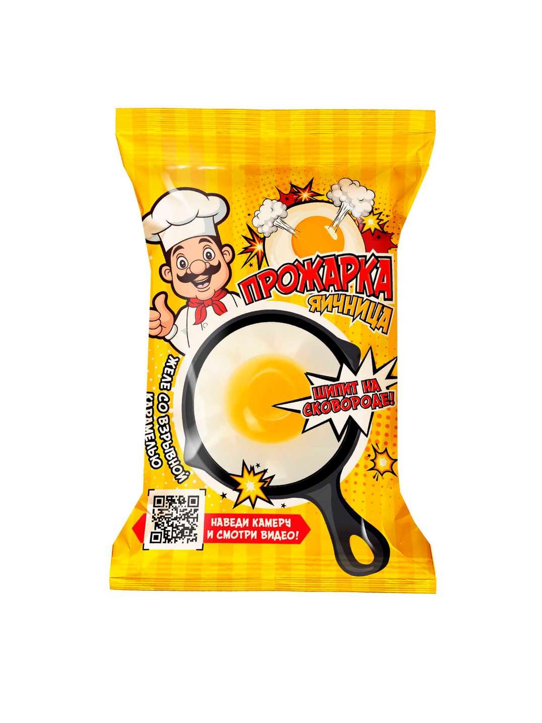 Необычный десерт в виде яичницы, который точно удивит любого сладкоежку! В наборе фруктовое желе в виде яичницы, пакетик со взрывной карамелью, сковородка и ложечка.